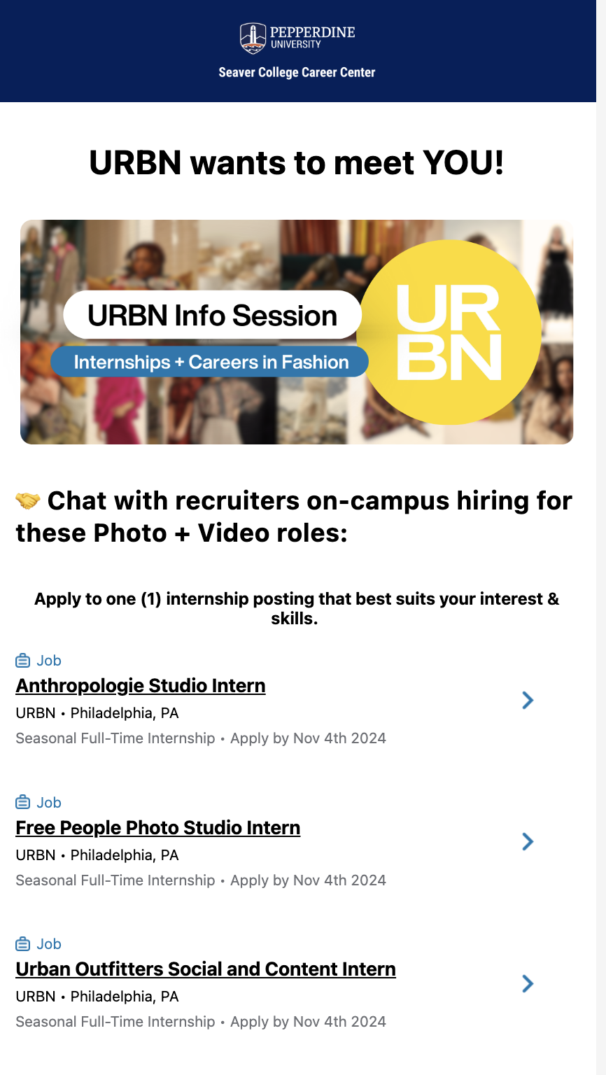 To capture the attention of undergraduates at Pepperdine University, Mia developed a weekly newsletter to 1.7k+ current students with 5+ targeted internships, apprenticeships, information sessions, educational resources, and industry updates.